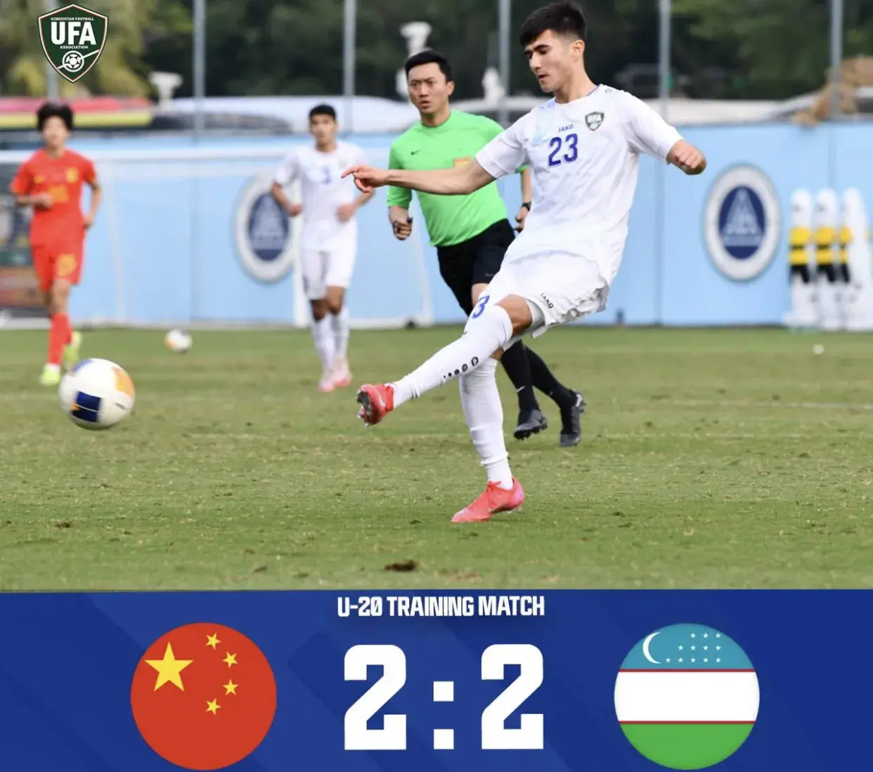 据国青队跟队媒体透露:本场热身赛是一场封闭比赛,所以乌兹别克国青派上主力阵容出战,而中国国青派出半主力阵容出战。比赛在上半场补时阶段乌兹别克国青打入1球,下半场乌兹别克国青再进1球,比赛前70分钟乌兹别克国青就以2球领先。随后中国国青陆续换上多名主力球员,并在第88分钟由刘诚宇打进1球,第92分钟由王钰栋打进第2球,最终双方打成平局。